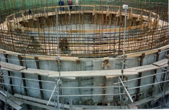 Debreceni szennyvízrothasztó tartály építése, csúszózsaluzattal, csúszóbetétes utófeszítéssel, egyszeresen extrudált momo- és kettős kábelekkel. Tervező: Mélyépterv Rt. Főváll: Vegyépszer Rt. Szerkezet építő: Délépszer Kft.