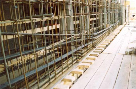Madách színház, 16 m-es nagyterhelésű utófeszített kiváltó tartó, csúszóbetétes feszítéssel, egyszeresen exrudált kettős kábelekkel. Fővállalkozó: KÉSZ Kft. Szerkezet építő: Délépszer Kft.