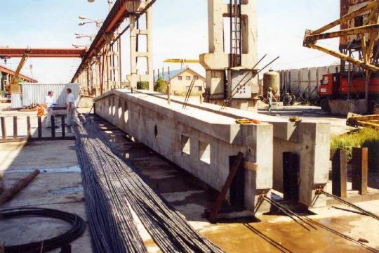 Győri AUDI csarnok 24 m fesztávolságú, T keresztmetszetű, utófeszített előregyártott gerendái, csúszóbetétes feszítéssel, egyszeresen extrudáltkettős kábelekkel